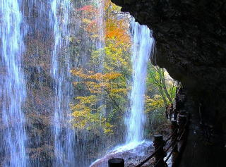 五色温泉を下った辺りに雷滝がある。小さな駐車場のため15分程順番待ち。裏見の滝とも呼ばれ、滝の裏側か見られる珍しい滝。水量が多ければ凄い迫力だと思う。