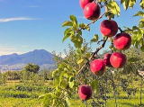 天候に恵まれた3日間、この旅の締めくくりはアップル街道沿いにある飯島リンゴ園。「秋映」と呼ばれる真っ赤な大玉リンゴをもぎ取りリンゴジュース。レンタカーを無事返却、日本最長距離(大阪-長野間441キロ)を走る昼行特急しなので帰阪している。<2025.10