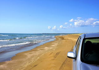 羽咋の今浜ICから千里浜IC間の8キロ程が海岸の砂浜を走れる有名な渚ドライブウェイ。海、白波、潮騒、青空に茶色ぽい美しい砂浜の絶景ドライブ。波打ち際に車を止めて癒しのひとときを過ごす。