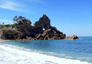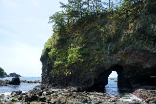 巌門から少し北上すると旗具岩。夫婦岩であるが片方が浸食貫通している。この地方に機織を広めた神が賊に襲われ、機織を海に投げて岩になったと地元の人から聞く。