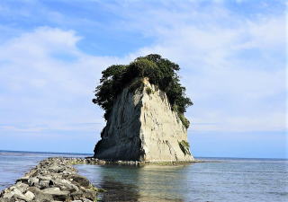 狼煙を過ぎると能登の内浦。富山湾に面した穏やかな海に変わる。海に浮かぶ軍艦のような島が直ぐ目につく。高さ30m弱、珪藻土岩の白い見附島。弘法大師空海が佐渡の布教を終えて能登に渡る時に見つけた島が、名前の由来になったと伝わる。