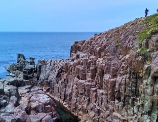 路線バスで東尋坊に向かう。1万年以上前の上昇マグマが冷却する過程で5~6角の巨大柱状節理になった。高千穂峡、層雲峡、玄武洞などでも見られるが、東尋坊は世界的にも大規模とされている。