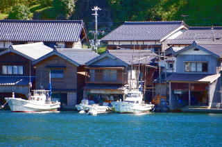 伊根漁港から遊覧船に乗って海から舟屋を眺めると、住居が海に浮かぶように見える。海辺に覆いかぶさるように建てられ1階を船のガレージや仕事場、2階を居室とした独特の住居形式は伝統的建造物に指定されている。最近は船が大型化、ガレージに入らないため外に停留されている。