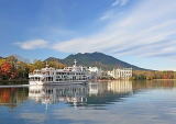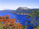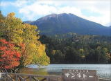 朝日に照らされた湖と雄阿寒岳が美しい。食事までの間、紅葉と白樺が入り交じる湖畔の林を抜けてボッケと呼ばれる噴火跡まで散歩した。