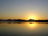 湖面に映る日の出が素晴らしいと聞いて夜明け前に起床した。青紫の空が少しずつ赤味をおびてくる。室内からでも眺められるが、コートを着込んで湖畔から日の出を眺める。