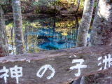 摩周湖の伏水が湧きだすことから神からの贈り物と呼ばれている。池の水温が低く倒木が化石化して沈んでいる。天気がよすぎて周囲の木々が池に映る。これが美しさを少しじゃましている。