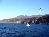 船上からの知床半島巡りは順光となる午後にした。波は少なく穏やか、海の色が深い。知床連山の景色もよい。アイヌ語の地の崖と言われる大自然の秘境地、その先端まで観光船オーロラから眺めることができた。
