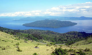 太陽が傾いてきた。標高525mの峠までS字カーブの道路を急いで駆け上がる。北海道の峠で最も美しいといわれているだけある。笹で覆われた斜面は木立に遮られることなく、緩やかに広がり屈斜路湖に浮かぶ中島や外輪山のパノラマは素晴らしい。