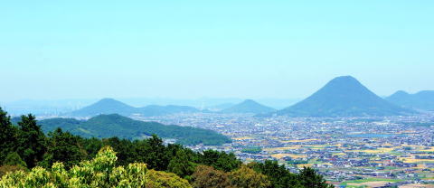 本殿横の見晴台から望む讃岐平野の景色が素晴らしい。天気がよく讃岐富士の向こうに瀬戸内海、瀬戸大橋まで望むことができる。
