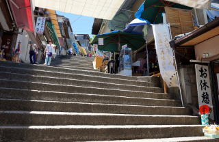 何段か登っては平坦になる。この繰り返しで一気に続く階段ではない。両側に土産物店が続き、ここまでは思ったより楽。113段目で一之鳥居。ここから一之坂と呼ばれる連続した長い石段になる。