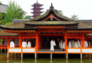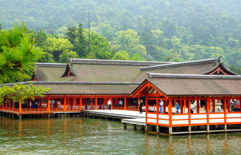 厳島神社は神にいつき祀る島「伊都伎嶋神社」と称された。この土地の豪族、佐伯氏が推古天皇時代に創建したと伝わる。中世期には神と仏が同居した。島の最高峰の弥山(ミセン)は真言宗の山岳信仰場であり、厳島神社の神宮寺として社僧を統括した。豊臣秀吉は九州遠征の時、武運を祈願して大経堂(千畳閣)と五重塔を建立している。江戸時代に入ると神仏習合の厳島参拝は民衆にも広まり門前町を形成した。