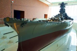 大和ミュージアムには6万9千トン、全長263m、幅40m、高さ約50m、46cm主砲12門を備えた戦艦大和の1/10模型がある。