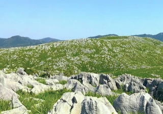 秋吉台 洞内奥のエレベーターで地上の秋吉展望台にでる。数億年前、海底火山の海面にできたサンゴ礁が地殻移動で隆起して台地化した。北東16キロ、北西6キロと日本最大のカルスト台地。