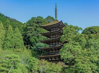 瑠璃光寺 大内文化を代表する曹洞宗の禅寺。国宝の五重塔は高さ31m、勾配が緩やかで先が跳ね上がった茅葺屋根、上層に向かって細い唐の禅様式。日本三名塔(法隆寺、醍醐寺)の中で最も美しいとされる。まもなく屋根の葺き替え工事が始まるため数年間見られなくなる。