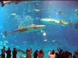 公園内の美ら海水族館は海からくみ上げた海水を再び海に返す循環システム。ジンベイザメやマンタなどが泳ぐ巨大水槽の強化アクリルの厚みは60cmもあり、世界最大と聞く。広大な敷地で2時間の自由見物時間は短く、イルカのおきちゃん劇場は見物できなかった。