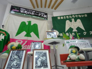 当時のVTRや歴代選手を紹介する写真パネル、優勝カップ、ユニフォームなどがある。日本一2回、リーグ優勝12回の記録を残したその栄光が記憶とともに懐かしく蘇る。