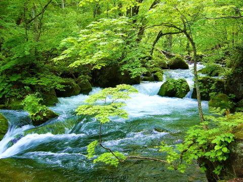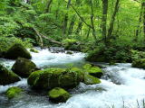 休屋から瞰湖台(カンコダイ)を経由して子ノ口で昼食。ここから焼山までの約14キロが奥入瀬渓流となる。ブナやカツラなど新緑のトンネルで覆われ、苔生した岩の間を激しく時にゆるやかな渓流が続く。要所要所で路肩に車を停めて渓流沿いを散策する。平日でどこも空いている。